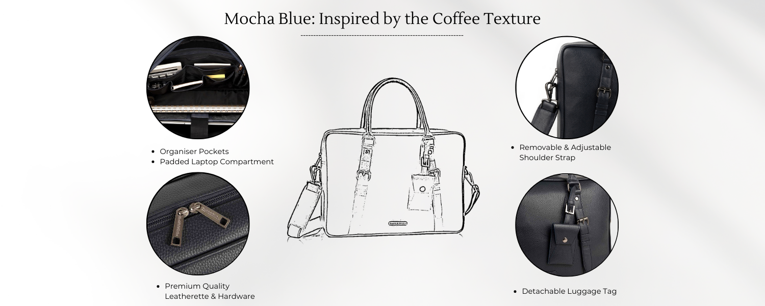Sip your own Mocha coffee and let it remind you of productivity and achievement. With the Mocha Blue Bag, success and sophistication are always by your side.