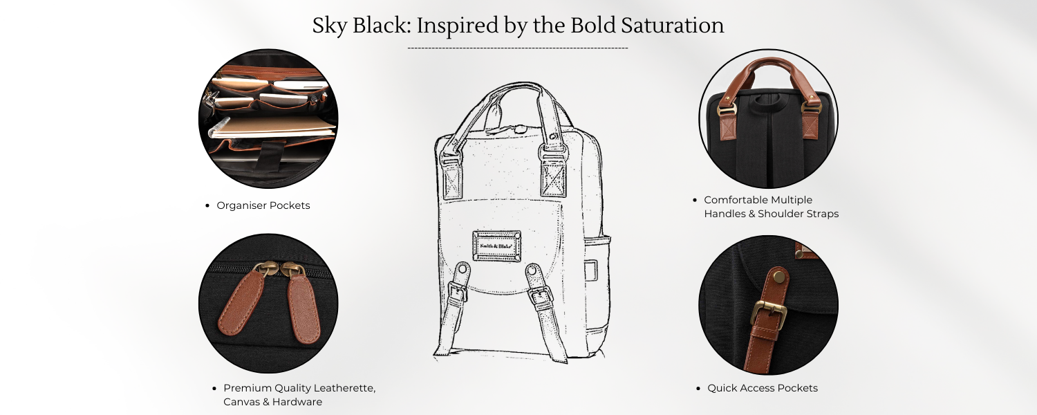 Smith & Blake is a brand that is known for its products that are luxuriously handcrafted with innovation and experience. Enhance your inner trendy style by carrying this Sky Black Backpack by Smith & Blake. Sleek silhouette made for people who prefer functionality and chic design. A perfectly spacious compartment with a different padded section for laptop and quick access organiser pockets for small things and accessories. Comes with shoulder handles as well as leatherette handles for you to choose your own style and comfort. Take it with you on a stroll to your next trip or daily to your office and stand out of the crowd with your personal style.