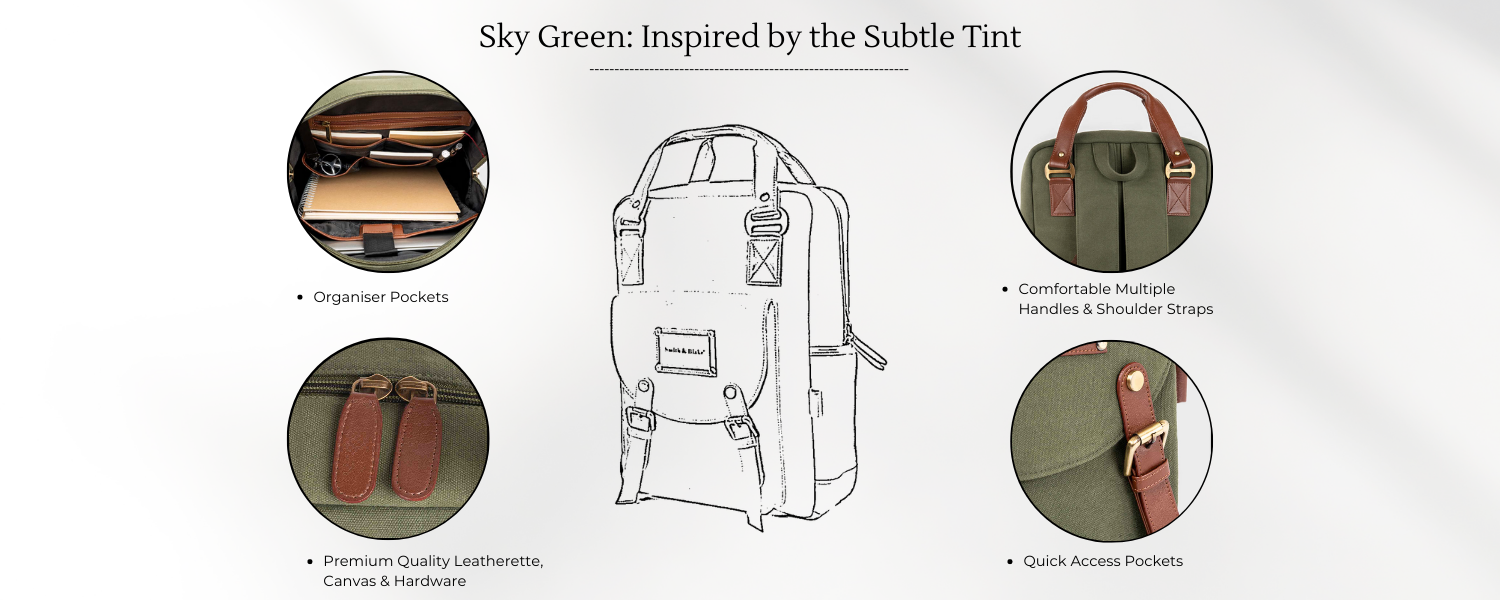 But don't let its professional functionality fool you - the Sky Backpack still embodies the spirit of adventure and freedom that Smith & Blake is known for. Its rich green and tan color palette is inspired by the natural world, reminding us that even in the midst of our daily routines, there is always a sense of wonder and possibility.