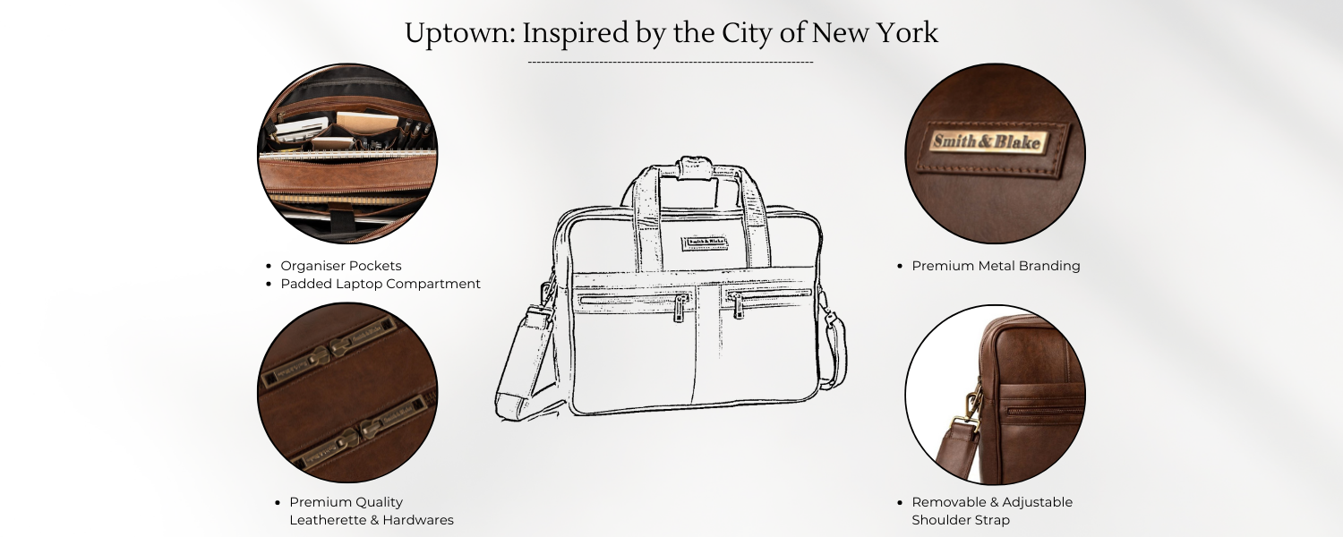 Smith & Blake is a brand that is known for its products that are luxuriously handcrafted with innovation and experience. Uptown is the essential messenger bag for the man on the move. There's a lot of space for your essentials and the perfect place to fit your laptop away from the hustle and bustle. Made with the best leatherette and premium hardware, this messenger bag is the perfect finishing touch to any outfit.