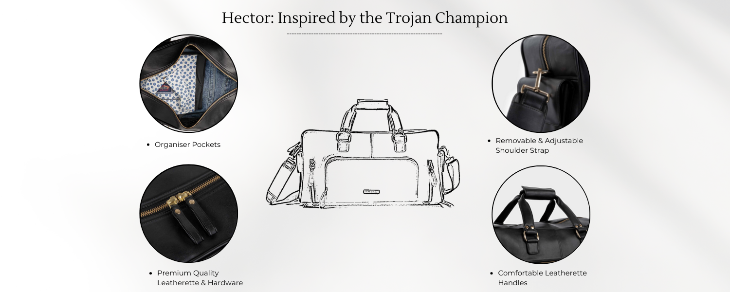 Introducing the Hector Duffle Bag, a masterpiece of style and functionality that embodies the spirit of adventure and strength. The name Hector was chosen for its association with Greek mythology, representing a legendary warrior known for his courage and unwavering determination. This duffle bag is designed to reflect those qualities, with a sleek black exterior and golden zips that exude elegance and sophistication. The design is inspired by the resilience and power of a warrior, ensuring durability and practicality. The spacious interior and well-organized compartments provide ample storage for your belongings, making it perfect for any journey. Whether you're embarking on a weekend getaway or conquering new horizons, let the Hector Duffle Bag be your trusted companion, empowering you to face every challenge with confidence and style. Choose Hector and embrace the spirit of adventure within you.